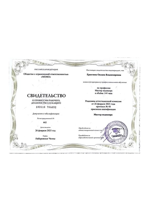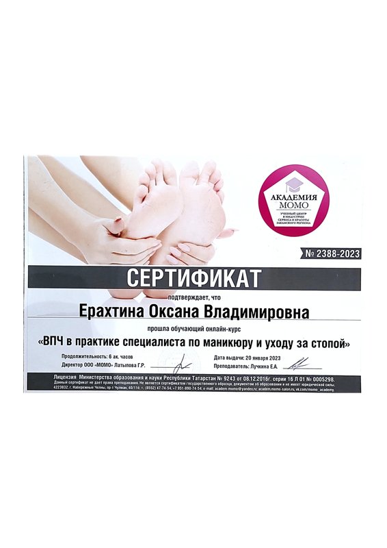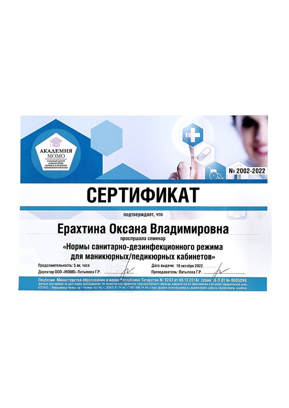Ходим к Оксане Владимировне Ерахтиной уже давно, мастер очень приятная и общительная. Особенно нравится сложный педикюр с пластинами, маме его делают профессионально. В центре всегда чисто, а стерильность инструментов и наличие всего необходимого для работы - это то, на что я сразу обращаю внимание.