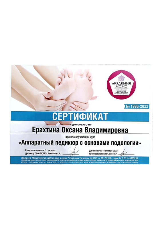 Хочу поблагодарить центр за профессиональный и внимательный подход к пациентам. У моего шестнадцатилетнего ребенка после танцев ногти стали синими, и мы обратились к подологу Оксане Владимировне Ерахтиной. Она оказалась очень доброжелательным и компетентным специалистом - подробно объяснила, что делать дальше, назначила капли для лечения ногтя на большом пальце. Врач успокоила нас, сказав, что это не грибок, и пообещала помочь справиться с проблемой. Остались очень довольны визитом!